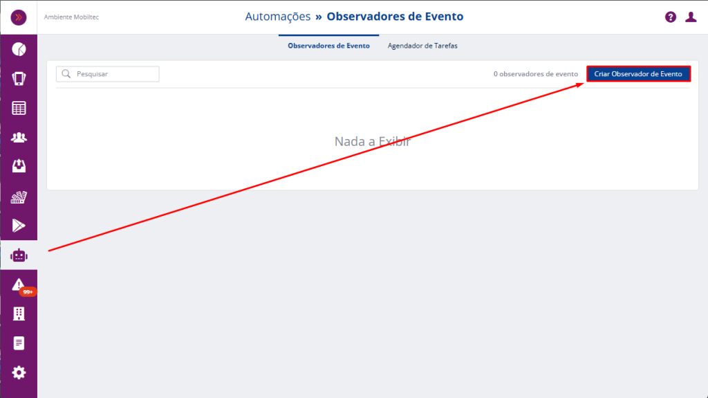 Já na tela de automações, localize no canto superior direito o botão “Criar observador de eventos“.