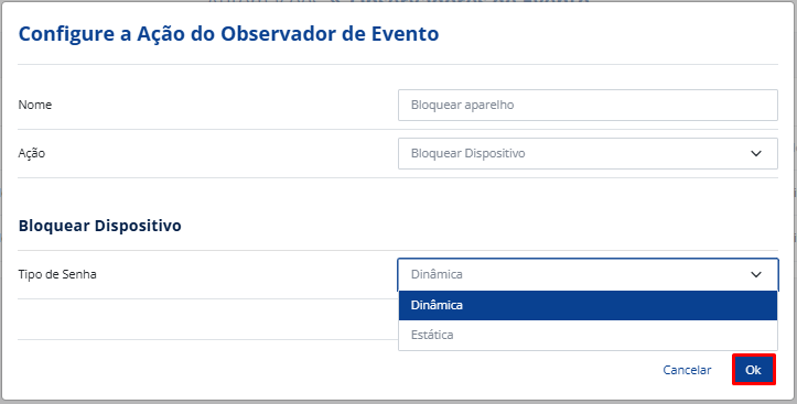 Em tipo de senha, você pode definir se a senha de desbloqueio do aparelho será dinâmica ou estática.