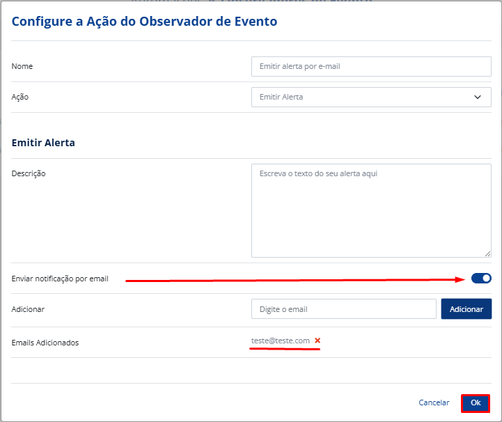 Marque a opção “Enviar notificação por email” e novos campos irão surgir. Você deverá informar todos os endereços de e-mail para os quais serão enviados os alertas.