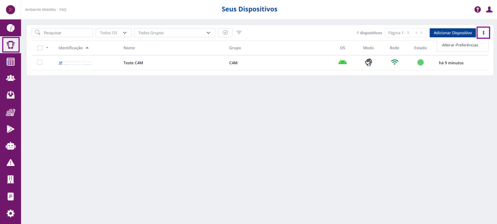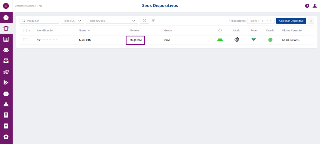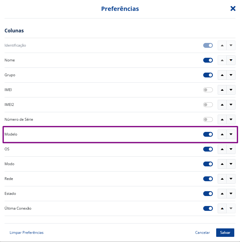 Entre os campos disponíveis para organizar as características dos ativos provisionados, o campo Modelo do dispositivo passa a estar disponível como opção de exibição na grid do módulo de Dispositivos, facilitando a visualização em caso de alteração do nome do dispositivo.