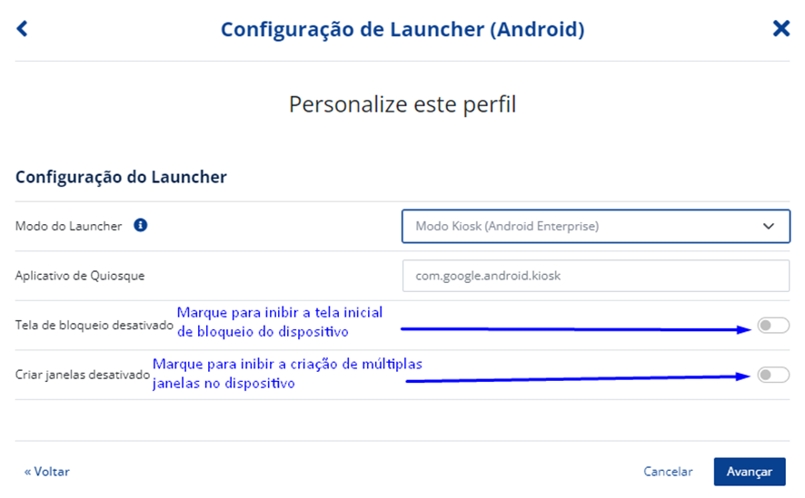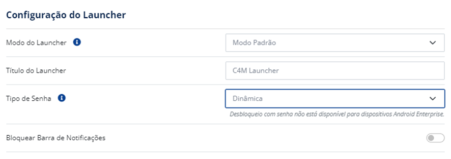 Se o seu modo de uso for Android padrão, você pode também definir uma senha (fixa ou dinâmica) para desbloqueio do aplicativo Launcher. Para Android Enterprise, o aplicativo Launcher fica sempre bloqueado.