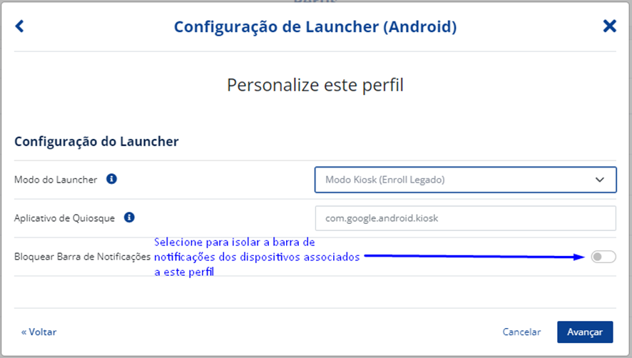 Após feitas todas as configurações na página, acione o botão ‘Avançar’ para completar a definição do perfil.
