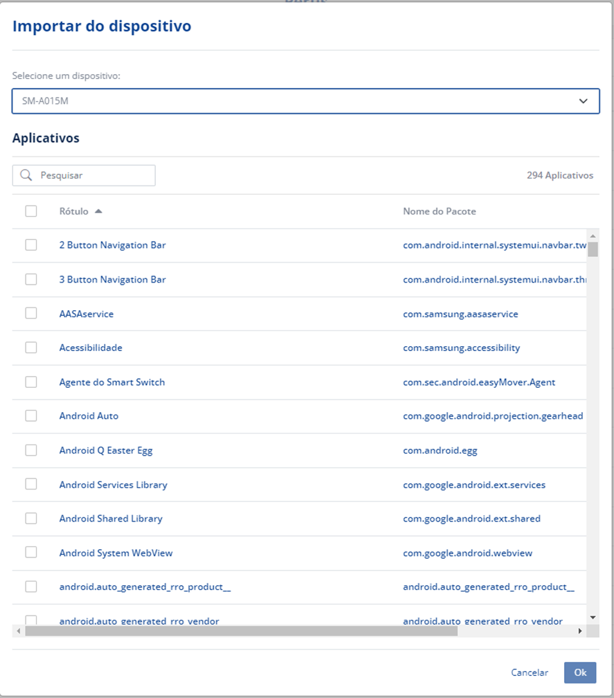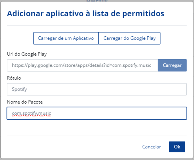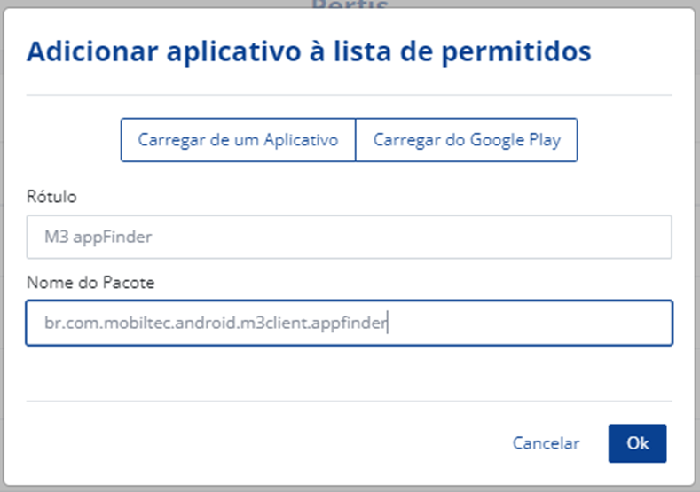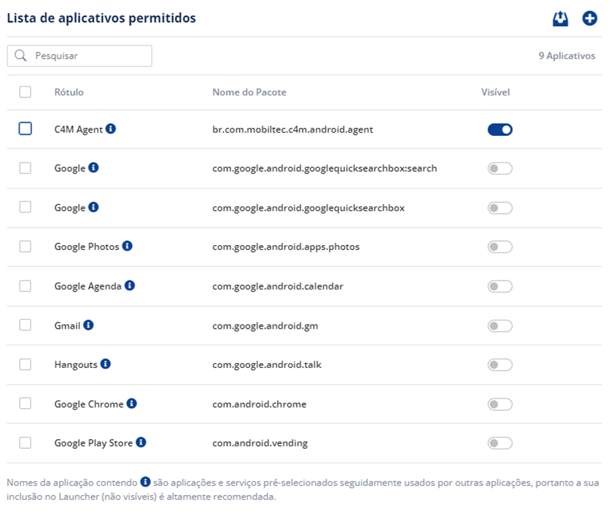 Na lista de aplicativos permitidos, você deve colocar o Nome (Rótulo) e o Nome do Pacote de todos os aplicativos que poderão ser executados no dispositivo. Podemos ter aplicativos permitidos que só serão passíveis de serem executados em retaguarda (background), não sendo visíveis ao usuário do dispositivo. Por exemplo, você pode não querer que o usuário use o aplicativo Câmera, mas você tem um aplicativo que o usuário usa que aciona em retaguarda a Câmera, e então este aplicativo Câmera deve ser permitido, sem estar visível. Um conjunto de aplicativos pré-selecionados, seguidamente utilizados por outras aplicações, já vem incluído por padrão na lista de permitidos.