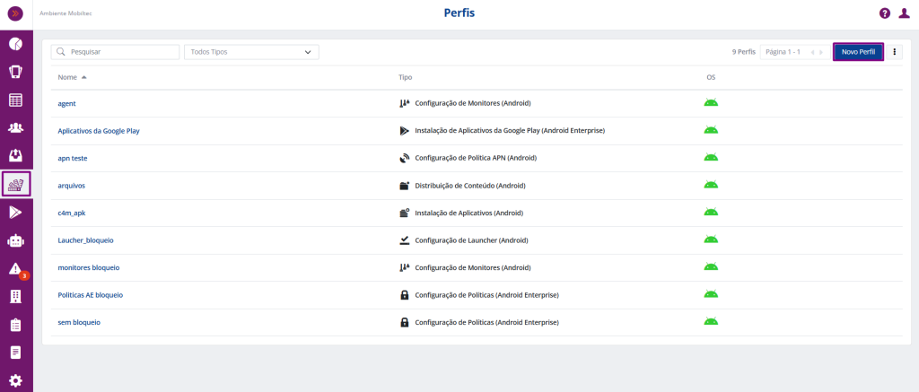 Na aba Perfis, no canto direito da tela clique em novo Perfil, selecione o sistema Android.
