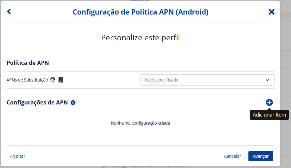 Esta ação é disponibilizada através da criação de um Perfil, onde é possível configurar uma lista de APNs (nomes de pontos de acesso) que o dispositivo pode usar para acessar a internet. Esse Perfil requer Android 6+.