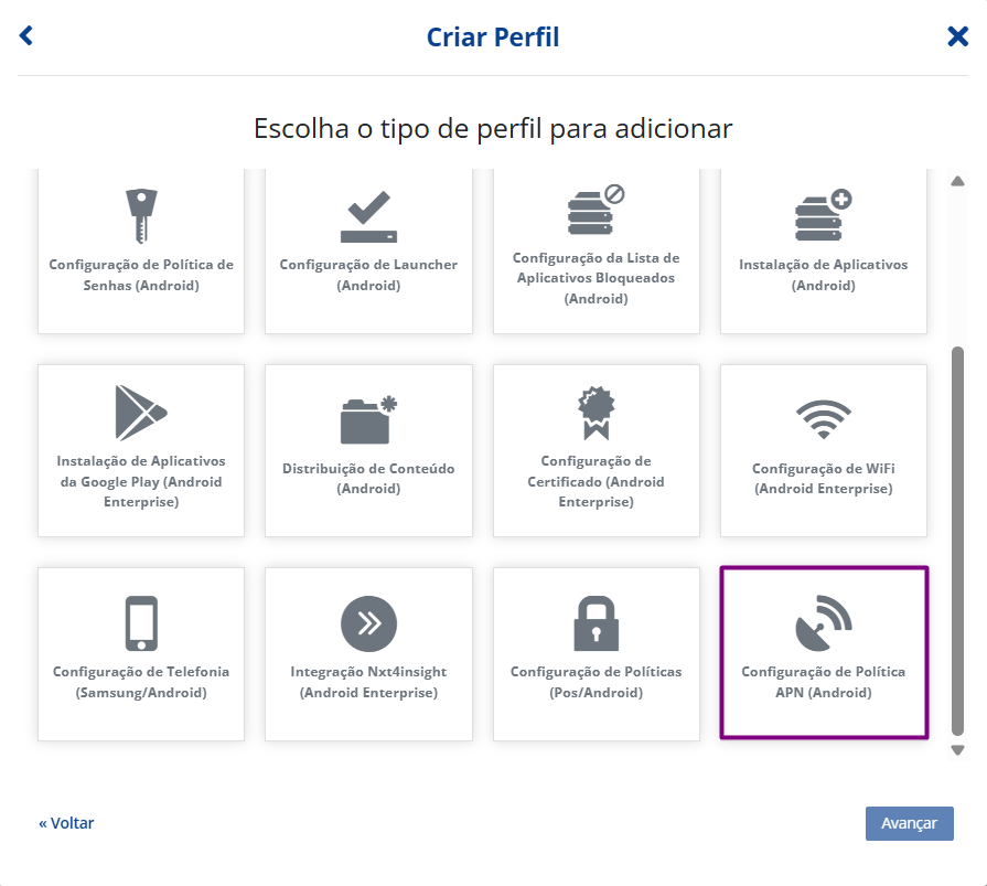Selecione o Perfil Configuração de Politica APN (Android), clique em Avançar depois é necessário personalizar o Perfil.