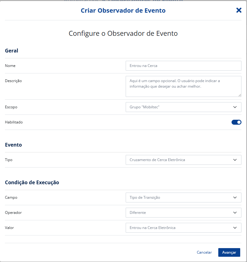 Em “Condições de Execução“, você deve definir as condições que irão fazer o evento ser disparado no ambiente. Como a ideia deste artigo é orientar no processo de entrada ou saída da cerca eletrônica, vamos realizar a configuração agora para um dispositivo que entrou na cerca eletrônica. Por fim, clique em “Avançar“.