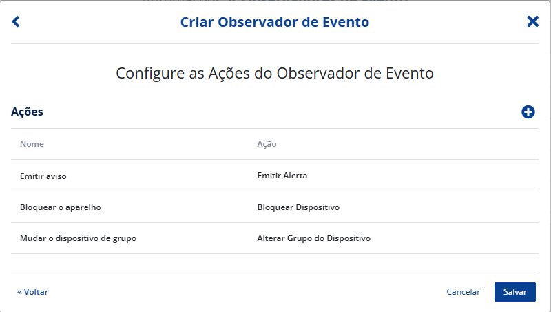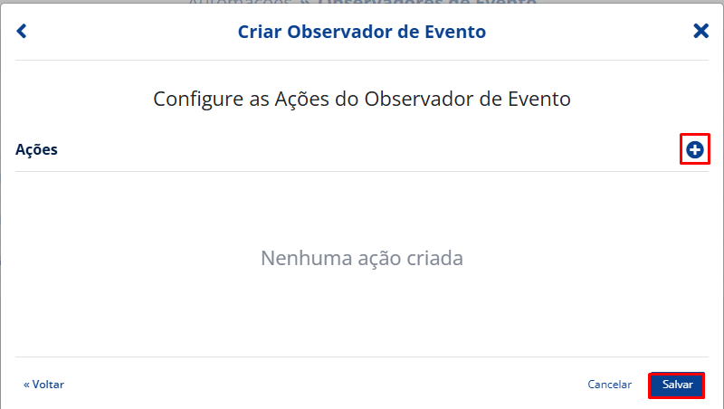 Clique no botão de “+” para configurar as ações.