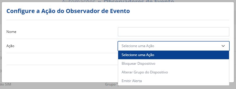 Você deve dar um nome para a ação e definir qual (daquelas disponíveis) você irá escolher. Conforme a imagem, é possível definir desde um simples alerta a até um comando de bloqueio do dispositivo.