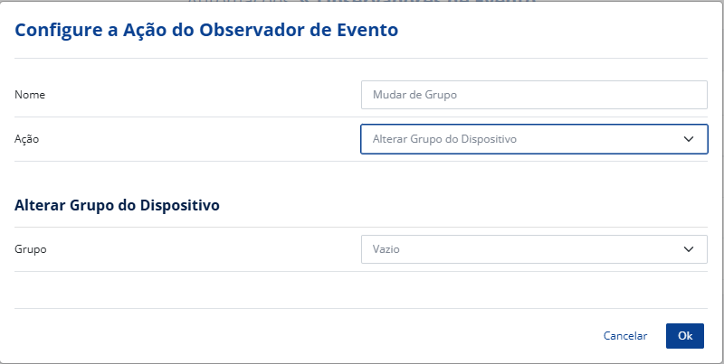 Dependendo da ação que você defina, novos campos irão surgir para que sejam definidos novos parâmetros. Abaixo está um exemplo mostrando a configuração de uma ação, onde o dispositivo será transferido para outro grupo.