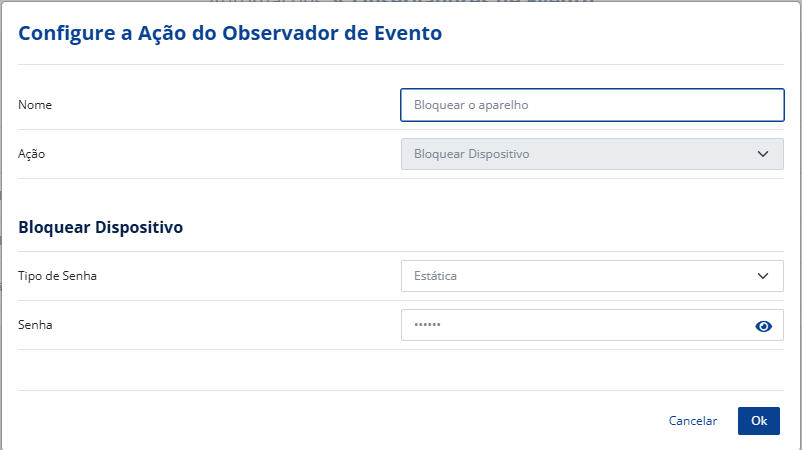 Neste caso, a ideia é configurar uma ação que irá bloquear o dispositivo. Você pode inclusive definir a senha para posterior desbloqueio do aparelho.