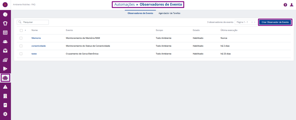 Em Automações> Observadores de Evento, no canto direito da Tela Clique em Criar Observador de Evento.