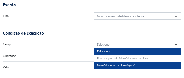 Em seguida, selecione o Evento Monitoramento de Memória Interna, em Condição de Execução podes escolher entre Porcentagem de Memória Interna Livre e Memória Interna Livre(bytes)