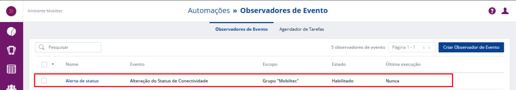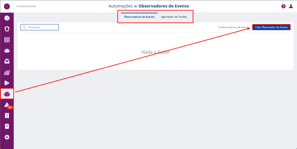 Já na tela de automações, localize no canto superior direito o botão “Criar observador de eventos“.