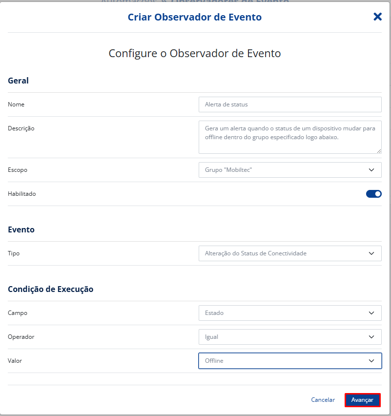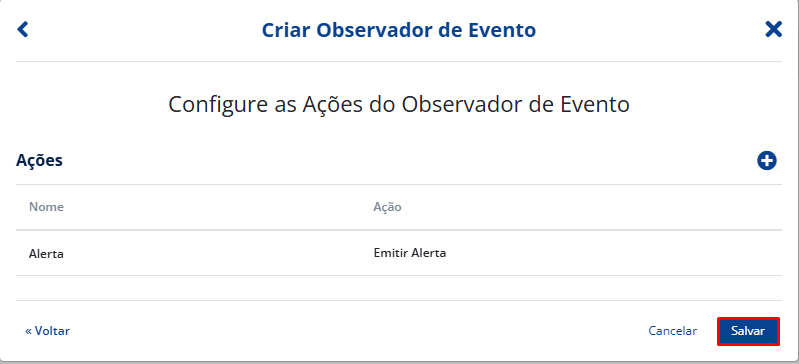 Configure o observador de eventos conforme a imagem abaixo. Após, clique em “Avançar“.