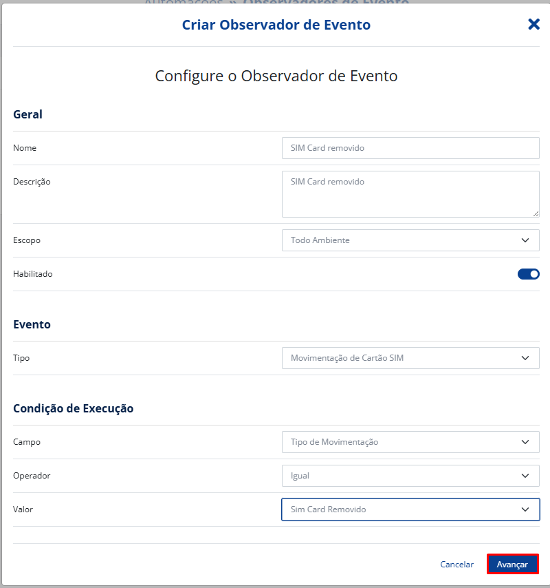 Configure o observador de eventos conforme a imagem abaixo. Após, clique em “Avançar“.