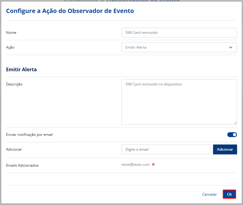 Há vários eventos que você pode configurar. É possível também criar mais de uma ação para um mesmo evento. Abaixo, mostramos a configuração de um alerta por e-mail. Ao final clique em “Ok“.