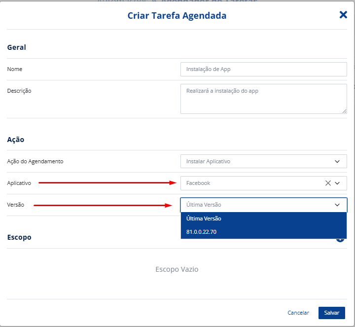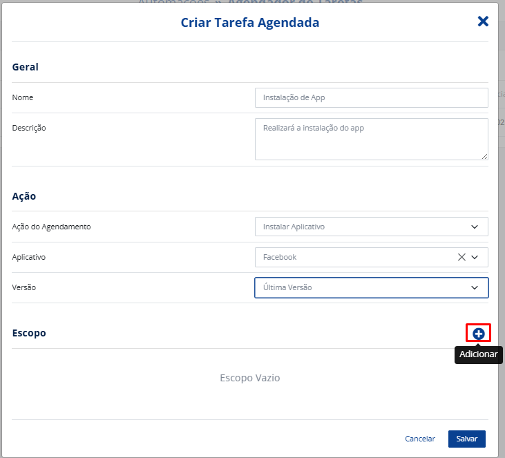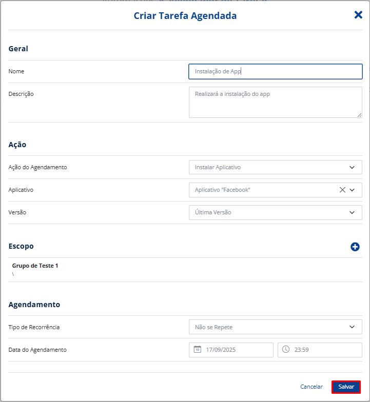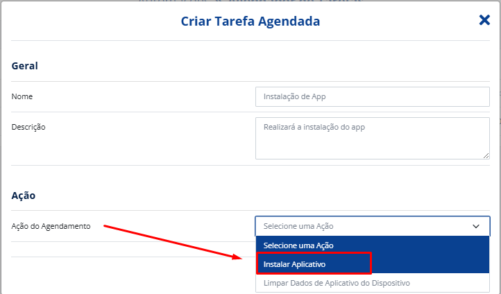 Surgirá a janela mostrada na imagem abaixo. Preencha os dados conforme necessário. No campo “Ação do Agendamento“, selecione a opção “Instalar Aplicativo“.