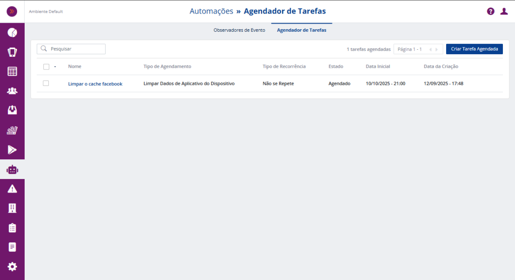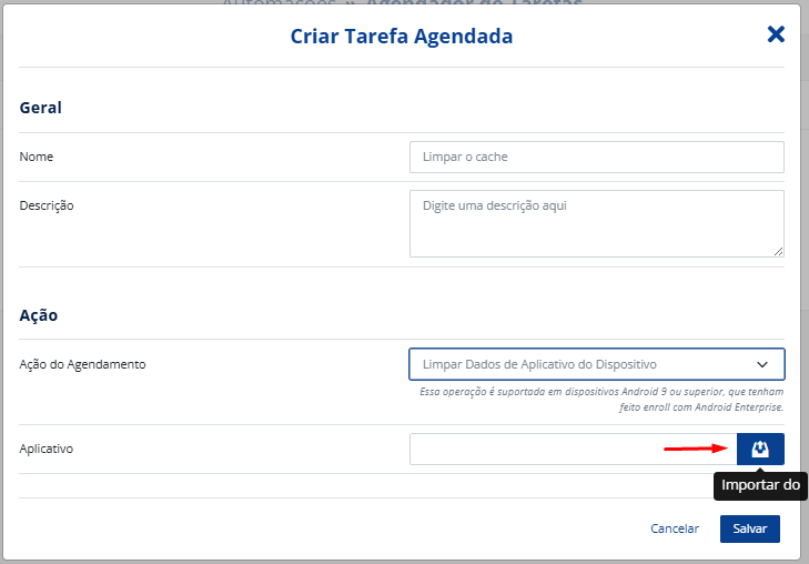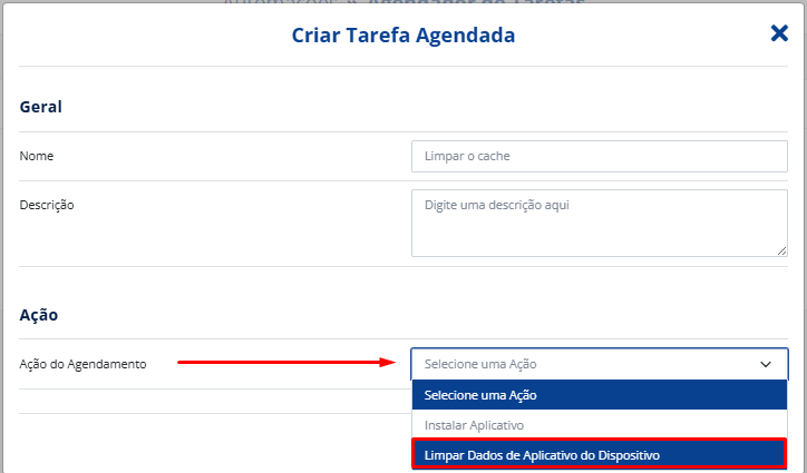 Surgirá a janela mostrada na imagem abaixo. Preencha os dados como nome, descrição (opcional) e em “Ação” escolha a opção “Limpar Dados de Aplicativo do Dispositivo“.