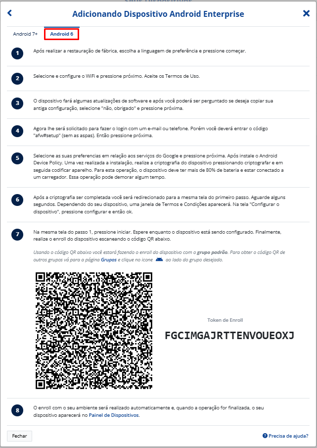O QRCode que aparecerá no seu ambiente, é diferente deste mostrado na imagem abaixo. Portanto, use o QRCode do seu ambiente. No enroll AFW, o dispositivo é direcionado para o grupo padrão (default) do console.