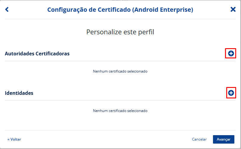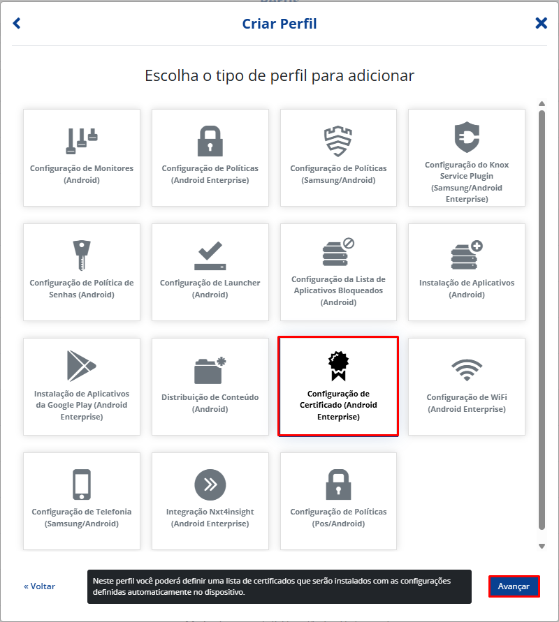 Selecione o perfil que deseja criar. Neste caso, vá em “Configuração de Certificado (Android Enterprise)“. Clique em “Avançar“.