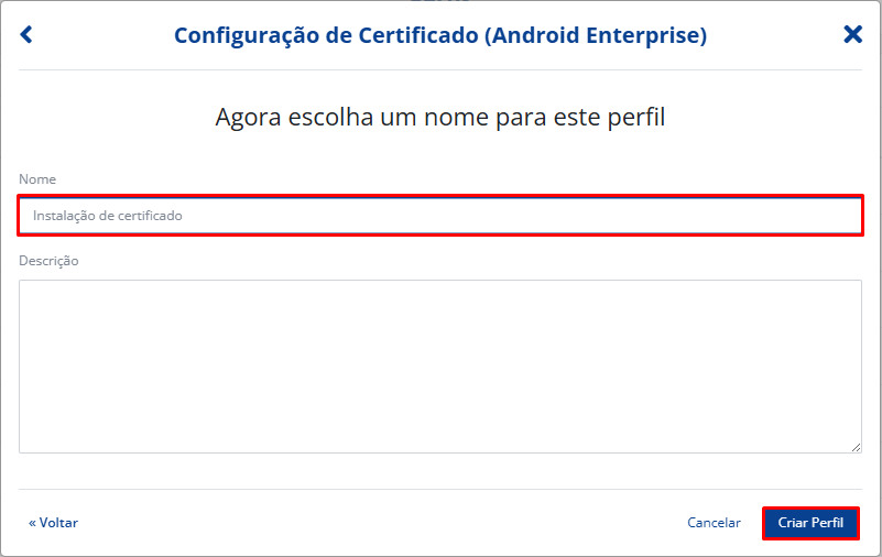 Após ter adicionado o certificado desejado, clique em “Avançar“. Na tela seguinte (abaixo), você deverá dar um nome ao perfil que está criando. Após, clique em “Criar Perfil“.