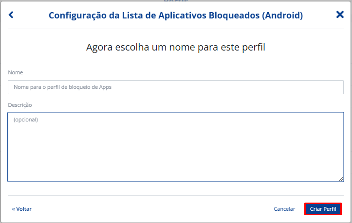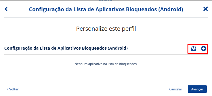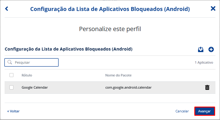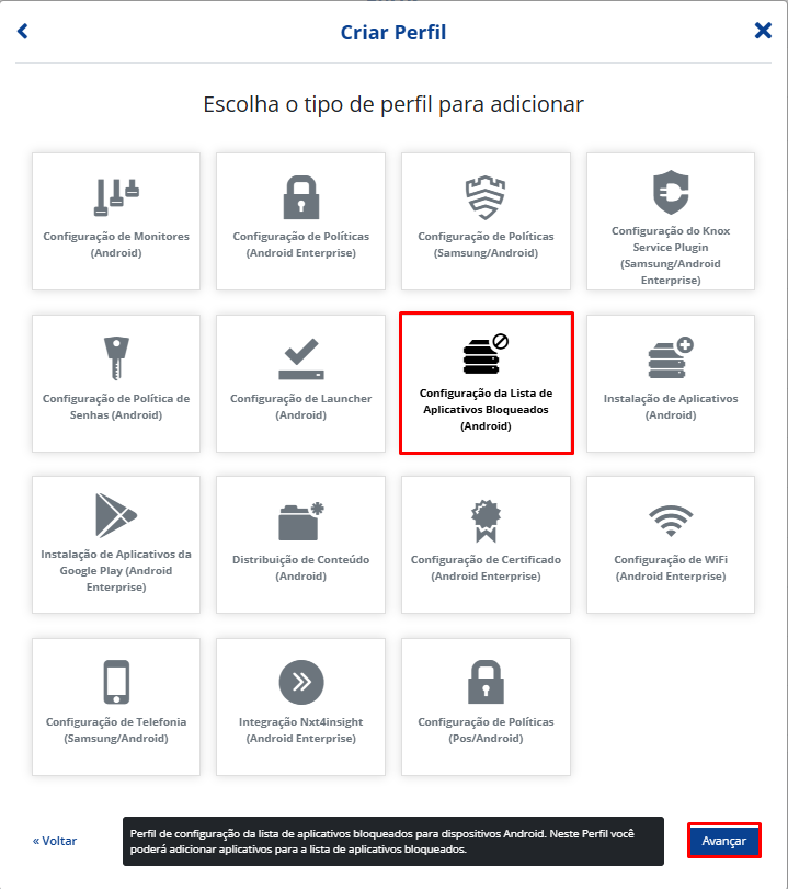 Selecione o perfil que deseja criar. Neste caso, vá em “Configuração da Lista de Aplicativos Bloqueados (Android)“. Clique em “Avançar“.