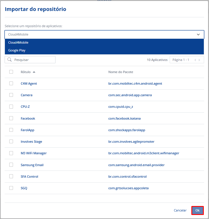 Já a opção “Repositório” permite que você importe o apk da lista de Apps aprovados na PlayStore, ou então, diretamente do repositório do C4M. Basta selecionar o repositório desejado e marcar a CheckBox dos apps desejados. Ao final, clique em “Ok“.